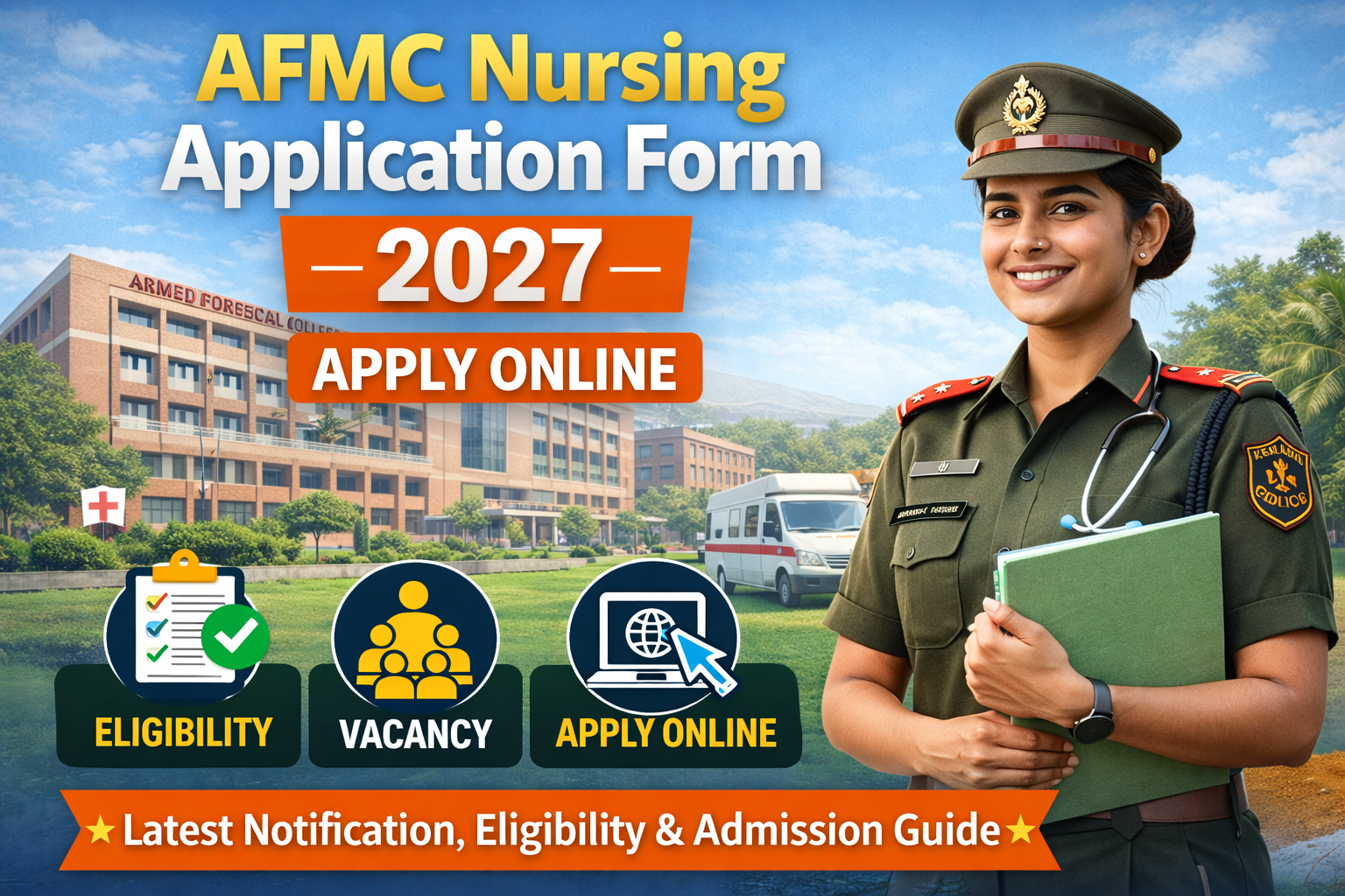 AFMC Nursing Application Form 2027 : The AFMC Nursing Application Form 2027 is an excellent opportunity for students who want to build a career in the military medical field. The admission is conducted by the prestigious Armed Forces Medical College, which operates under the Indian Armed Forces. Every year, the college invites applications for admission into the B.Sc Nursing program for female candidates. Students who qualify for the program later serve in the Military Nursing Service (MNS) and work in army hospitals across India. In this article, you will learn about eligibility, vacancy details, admission process, job type, salary, and how to apply online for AFMC Nursing Application Form 2027.