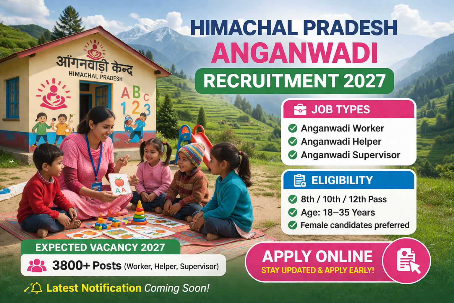 Himachal Pradesh Anganwadi Recruitment 2027 : The Himachal Pradesh Anganwadi Recruitment 2027 is a great opportunity for candidates, especially women, who want a government job in social welfare π₯. Every year, the Women and Child Development Department releases Anganwadi vacancies for helper, worker, and supervisor posts. The latest notification for 2027 is expected soon. In this article, you will get complete details about eligibility, vacancy, job type, and apply online process.