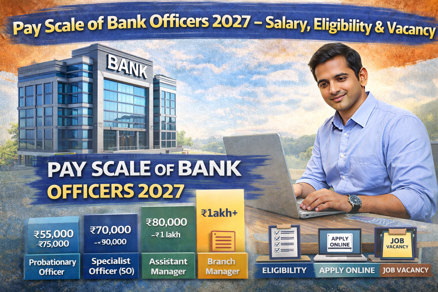pay scale of bank officers : If you are planning a career in banking, understanding the pay scale of bank officers is very important. Bank officer jobs are among the most secure and respected government jobs in India. Every year thousands of candidates wait for the latest notification for bank officer recruitment 2027 to apply online. Along with job security, bank officers receive good salary, allowances, and career growth. In this guide, we will explain bank officer salary structure, eligibility, vacancy details, job types, and how to apply online in 2027.